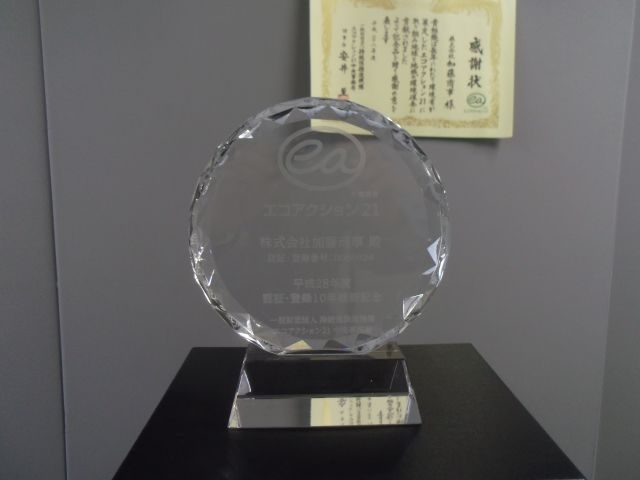 12月6日、エコアクション21の10年継続事業者として表彰されました。